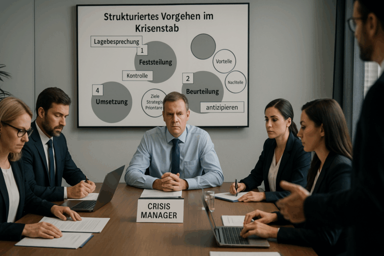 Ein strukturiertes Vorgehen ist die Grundlage erfolgreicher Krisenstabsarbeit. Die Lagebesprechung gliedert sich in die Phasen Feststellung, Beurteilung und Entscheidung. Darauf folgt die Arbeitsphase, in der die Maßnahmen umgesetzt und kontrolliert werden. Dieser Regelkreis schafft Klarheit, Transparenz und Flexibilität – und sorgt dafür, dass Krisenstäbe schnell, koordiniert und resilient handeln können. Wissenschaftliche Grundlagen (u. a. BBK, BSI, ISO 22320) und Praxiserfahrungen (z. B. Pandemie, Flut, Stromausfälle) zeigen, dass die konsequente Anwendung dieses Modells die Handlungsfähigkeit in komplexen Lagen maßgeblich erhöht.