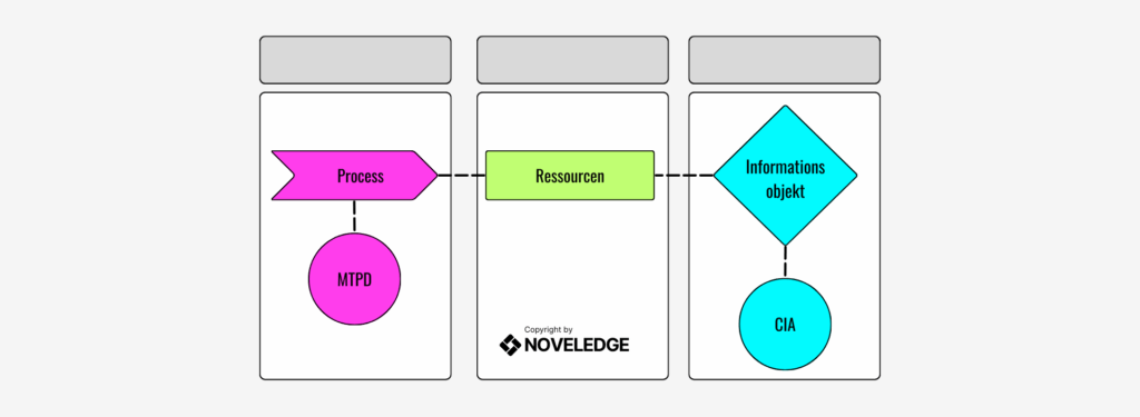 Ressourcen können den jeweiligen Prozessen direkt zugeordnet werden. Für jede Ressource lassen sich individuelle Zusatzinformationen, Zuständigkeiten oder abweichende Abhängigkeiten erfassen. Gleichzeitig können auch Informationsobjekte dokumentiert werden. Für diese Informationsobjekte lassen sich deren jeweilige Abhängigkeitensowie die erforderlichen Anforderungen an Vertraulichkeit, Integrität und Verfügbarkeit (CIA) erfassen. Dadurch können Prozesskritikalitäten und Informationsschutzbedarfe in einem integrierten Erfassungsschritt berücksichtigt werden.