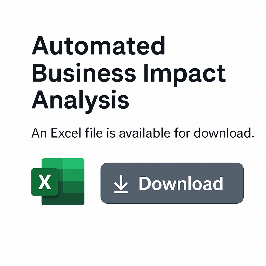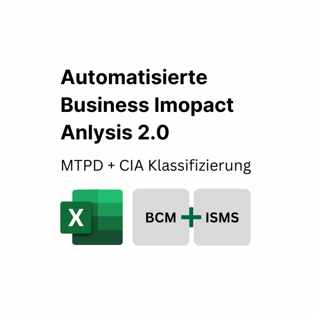 Die automatisierte Business Impact Analysis ermöglicht eine strukturierte Erfassung kritischer Geschäftsprozesse, Ressourcen und Abhängigkeiten. Die bereitgestellte Excel-Datei enthält integrierte Berechnungslogiken und standardisierte Eingabefelder, wodurch die Datenerhebung und Verarbeitung deutlich vereinfacht und ein konsistentes Ergebnisformat gewährleistet wird.