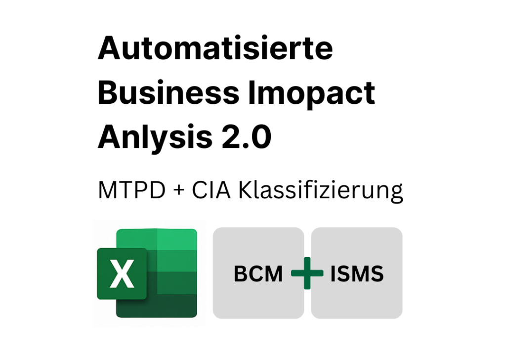 Die automatisierte Business Impact Analysis ermöglicht eine strukturierte Erfassung kritischer Geschäftsprozesse, Ressourcen und Abhängigkeiten. Die bereitgestellte Excel-Datei enthält integrierte Berechnungslogiken und standardisierte Eingabefelder, wodurch die Datenerhebung und Verarbeitung deutlich vereinfacht und ein konsistentes Ergebnisformat gewährleistet wird.
