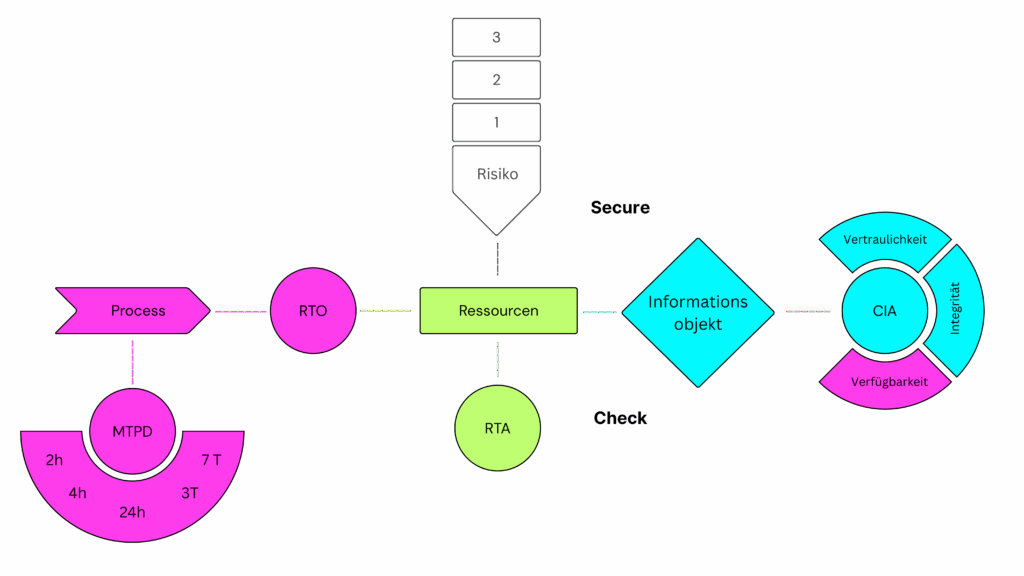 Besonders die Availability ist eng mit den zuvor ermittelten RTO-Werten verbunden. Informationsobjekte – und damit die Ressourcen, die sie tragen – müssen innerhalb der MTPD bzw. RTO verfügbar sein. Andernfalls entsteht eine direkte Lücke in der Resilienz.